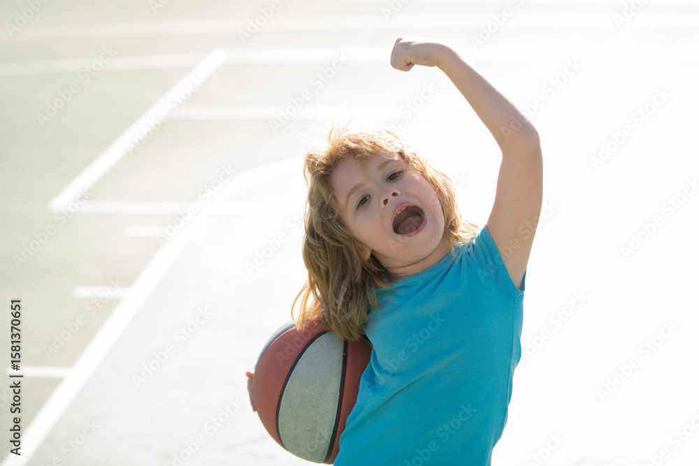 Child playing basketball on outdoor court. Happy child boy hold basketball ball. Summer sport kids. Child on basketball game. Sporty child training basketball. Outdoor sport for children.