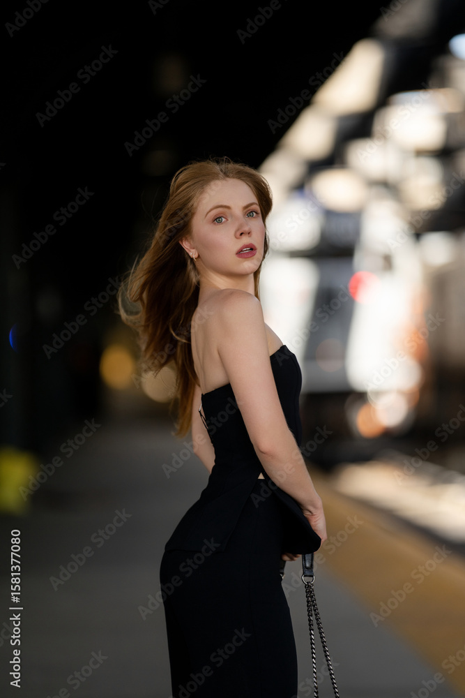 Woman waiting for a train at the station. Young traveler. Model on vacation trip. Girl by train wagon. Portrait of a pretty traveler. Woman at railway station. Summer holiday vibes. Travel and style.