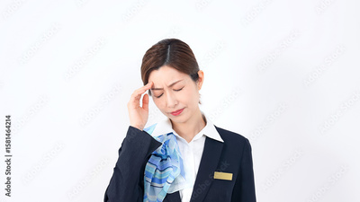 落ち込む、頭痛、女性、スタッフ、店員、がっかり、残念、ストレス、疲労、偏頭痛、考える、悩む、悩み、困る、疑問、心配、不安、不満、トラブル、挫折、問題、緊張、プレッシャー、過労、後悔、悔しい、受付、案内、接客、ホテリエ、CA、キャビンアテンダント、サポート、スカーフ、人材、仕事、クレーム、ビジネス、うんざり、ビジネスパーソン、ビジネスウーマン、キャリアウーマン、日本人、ミドルエイジ、30代、40代、