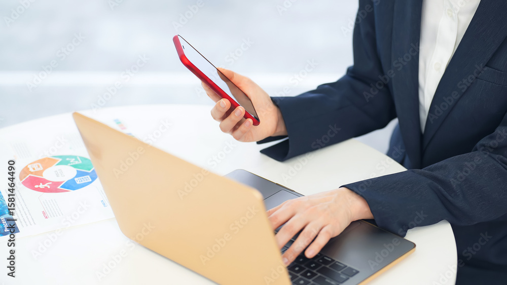 ノートパソコンとスマホを使う女性ビジネスパーソン