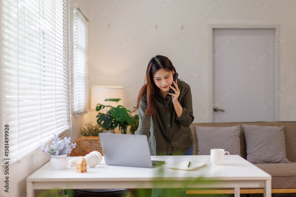 Young happy fun secretary employee business asian woman in casual shirt work stand at white office desk with pc laptop hold mobile cell phone in office.