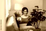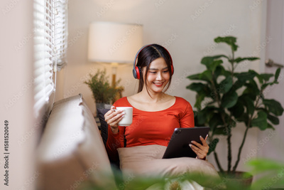 Relax Concept. Happy asian woman drinking coffee holding tablet in hand sitting on comfortable couch at home. dreaming Cheerful casual female resting on sofa, enjoying weekend free time.
