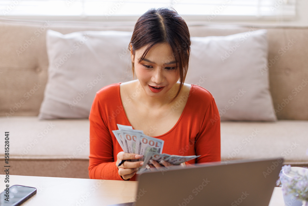 Money cash dollar rain falling, Financial concept. Make money on the Internet. Asian woman sitting on the desk and working with a laptop celebrating success play casino online game.