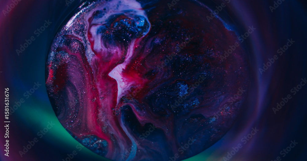 Color ink spill. Bright emulsion. Defocused red purple yellow ink silver circle spreading on abstract neon acrylic art background.