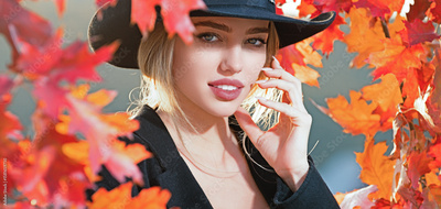 Autumn girl with leaves of maple trees posing outdoor. Dreamy girl in fall. Beauty model, young beautiful woman hold autumn leaves. Romantic woman in autumn park. Autumn fall concept.