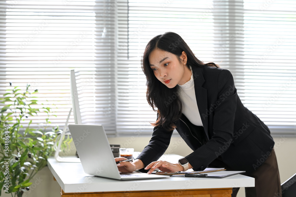 Focused businesswoman reviewing financial data while standing at desk in a bright workplace