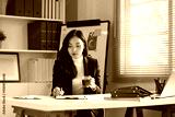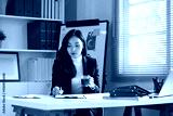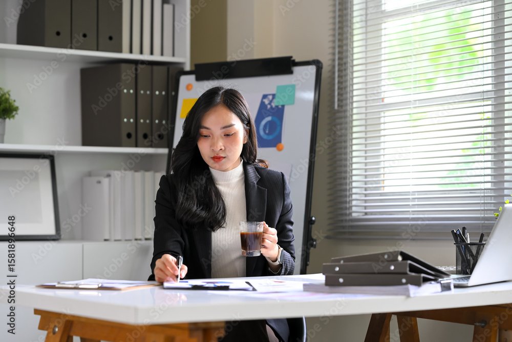 Professional businesswoman reviewing financial documents and charts at a modern office desk.