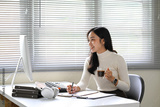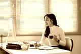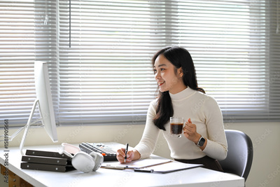 Young businesswoman working at her desk while holding a cup of coffee during a productive day