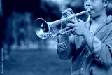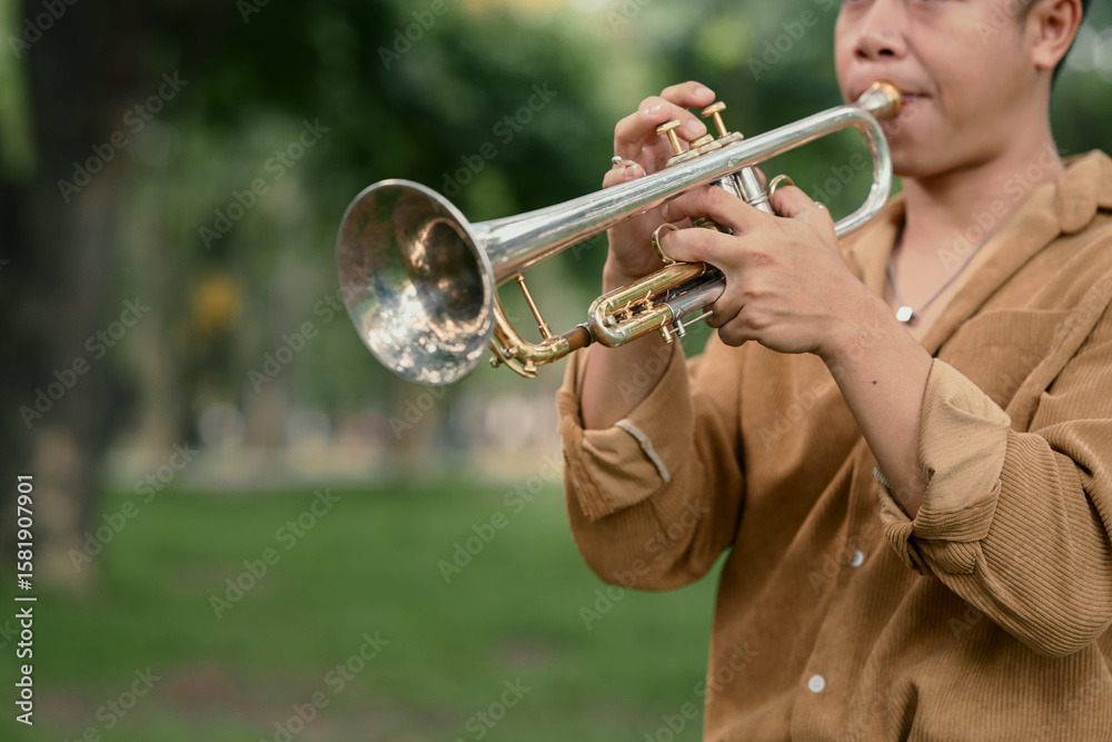 Young man playing trumpet in a park, enjoying music in a peaceful outdoor
