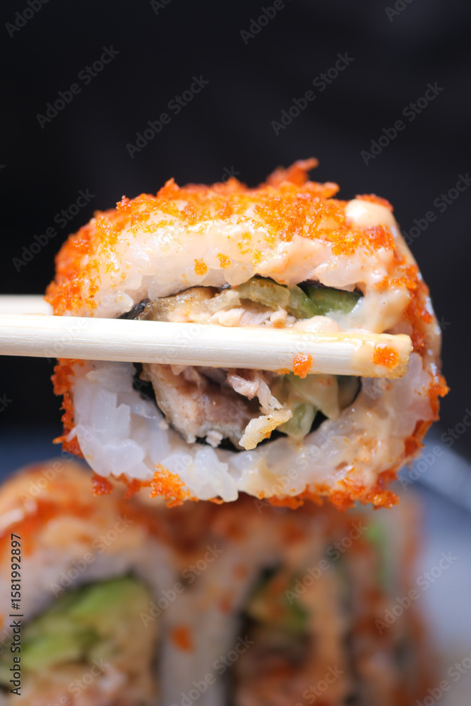 Delicious sushi roll held with chopsticks before consumption