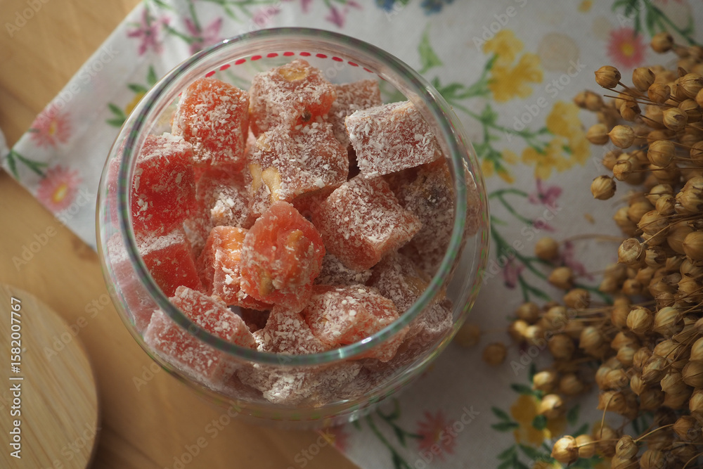 Colorful Turkish delight in a glass jar on a floral cloth