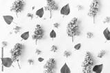 Flat lay top view photo of a pattern made of a lilac flowers, leaves and petals.