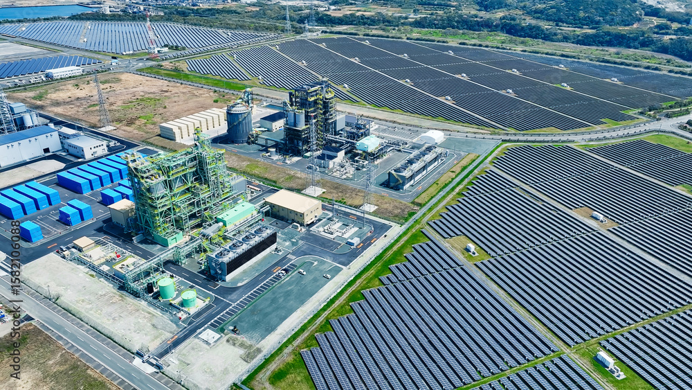 Aerial view of biomass power plant and wind and solar power plant