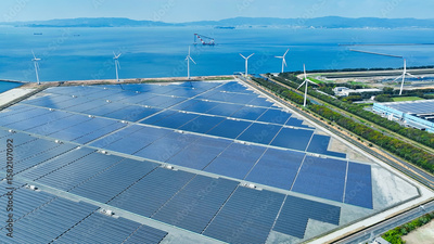 風力発電、風車、太陽光発電、ソーラーパネル、空撮、エネルギー、環境、再生可能エネルギー、サステナビリティ、SDGs、エコロジー、カーボンニュートラル、風景、産業、設備、施設、景色、青空、パノラマ、広角、地平線、ドローン、ブルー、グリーン、クリーン、工場、電力、スマートグリッド、カーボンオフセット、ゼロエミッション、トランスフォーメーション、GX、SX、エコフレンドリー、ESG投資、CSR、レジリエ