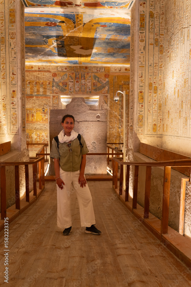 Tourist exploring ancient egyptian tomb with colorful paintings and hieroglyphics