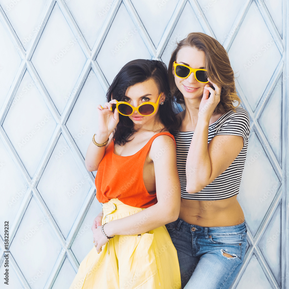 portrait of a beautiful young couple fashionable girls blonde and brunette in a bright yellow dress and sunglasses posing and smiling for the camera