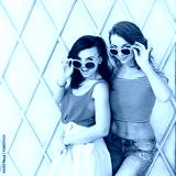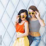 portrait of a beautiful young couple fashionable girls blonde and brunette in a bright yellow dress and sunglasses posing and smiling for the camera
