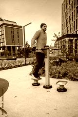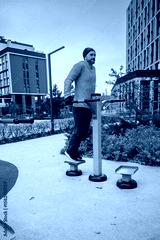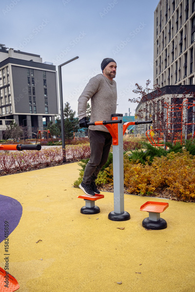 Man exercising on outdoor fitness equipment in a modern urban park setting. Healthy lifestyle in the city.