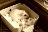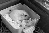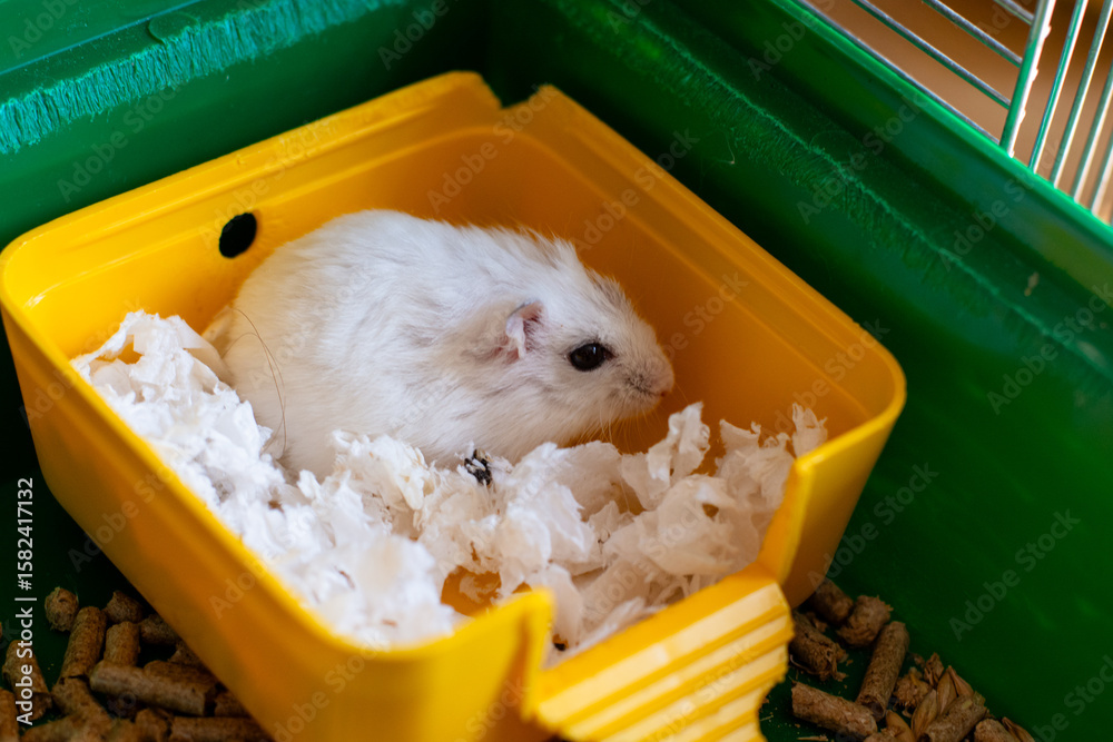 Cute white hamster relaxing in yellow plastic bed with paper bedding inside a green pet cage, close-up view.