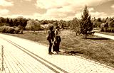 Two people stand on a paved path in a sunny park, looking and pointing towards something off-camera. Lush green grass, trees, and a bright blue sky create a beautiful spring or summer scene.