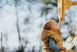 A young child dressed warmly engages with playground equipment, enjoying a sunny day outside.