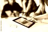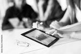 Group of young men and woman coworking with tablet computer