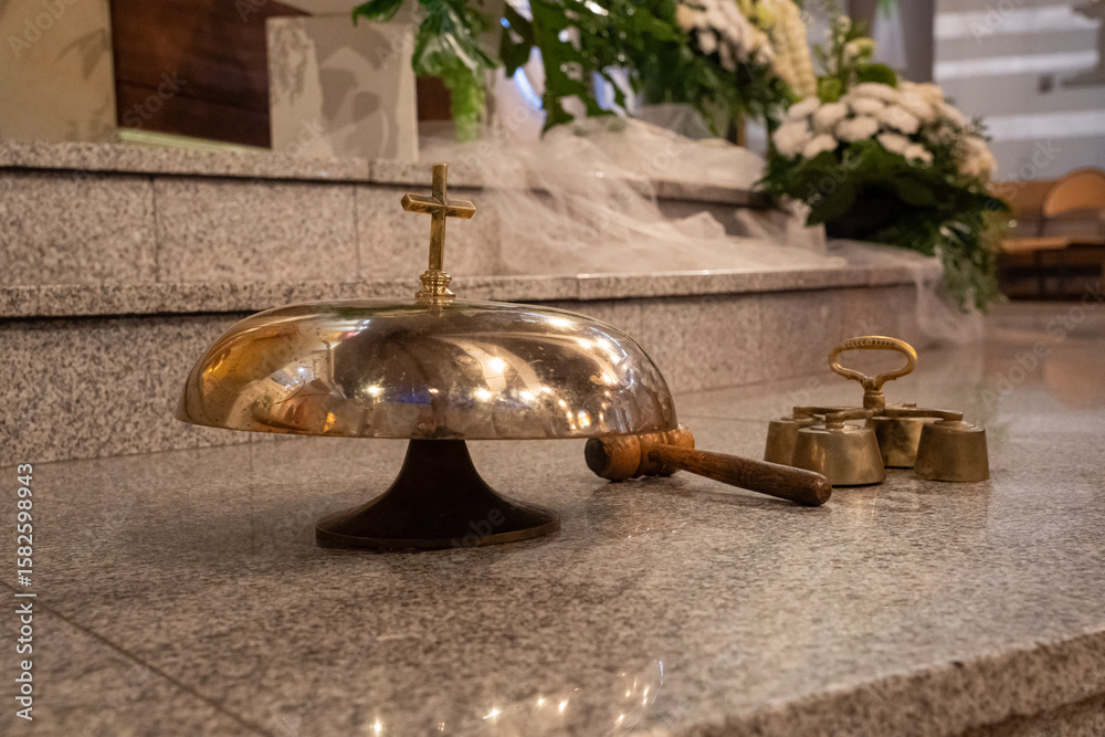 dzwonki i gong przygotowane do obrzędów liturgicznych w kościele