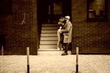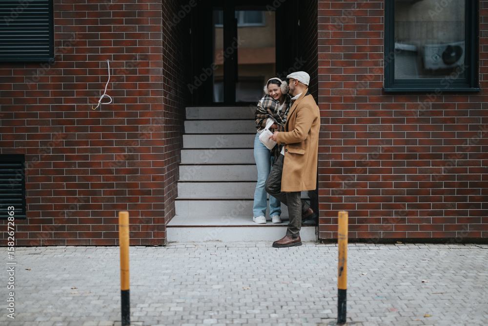 A young couple enjoys a relaxed moment outside on a city street. They lean against a modern brick building while talking and laughing, capturing a candid urban lifestyle scene.