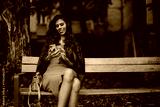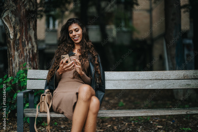 A cheerful woman with long hair sits on a park bench, smiling while looking at her smart phone. The scene captures a relaxed, autumn day in an urban park setting.