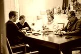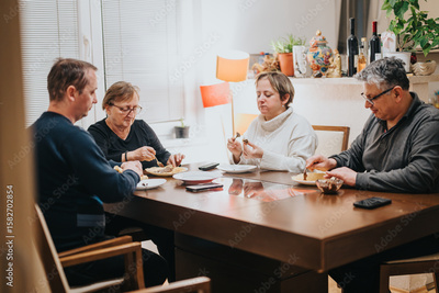 An intimate gathering of four individuals enjoying a meal at home, sharing moments of togetherness, warmth, and connection around a dining table in a modern interior.