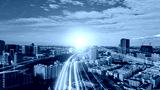 Cityscape and a strip of light stretching into the future