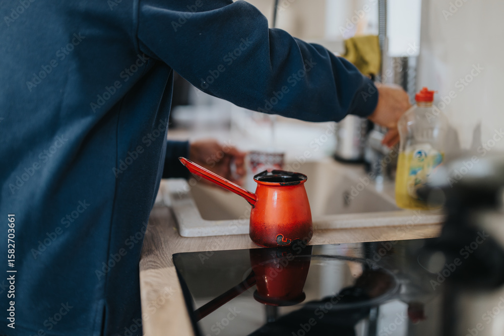 A person is working in a kitchen, preparing coffee or tea using a bright red enamel pot on the stove.