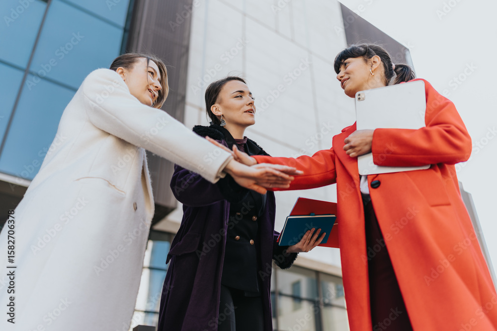 Three confident businesswomen engage in a team discussion outdoors, symbolizing collaboration and teamwork.