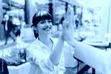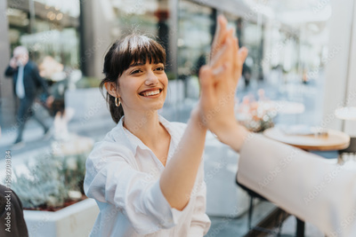 Smiling woman sharing a high-five in a collaborative and positive environment.