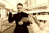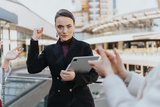 Confident businesswoman standing with a tablet, interacting with colleagues outdoors. An inspiring moment capturing a driven, professional individual demonstrating leadership and collaboration.