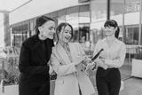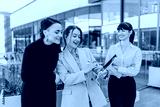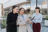 Three professional women engaging in a friendly and collaborative meeting while discussing a business project, fostering teamwork and innovation.
