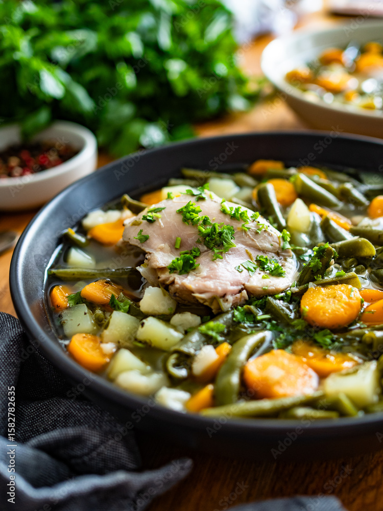 Green bean soup with chicken meat on wooden table