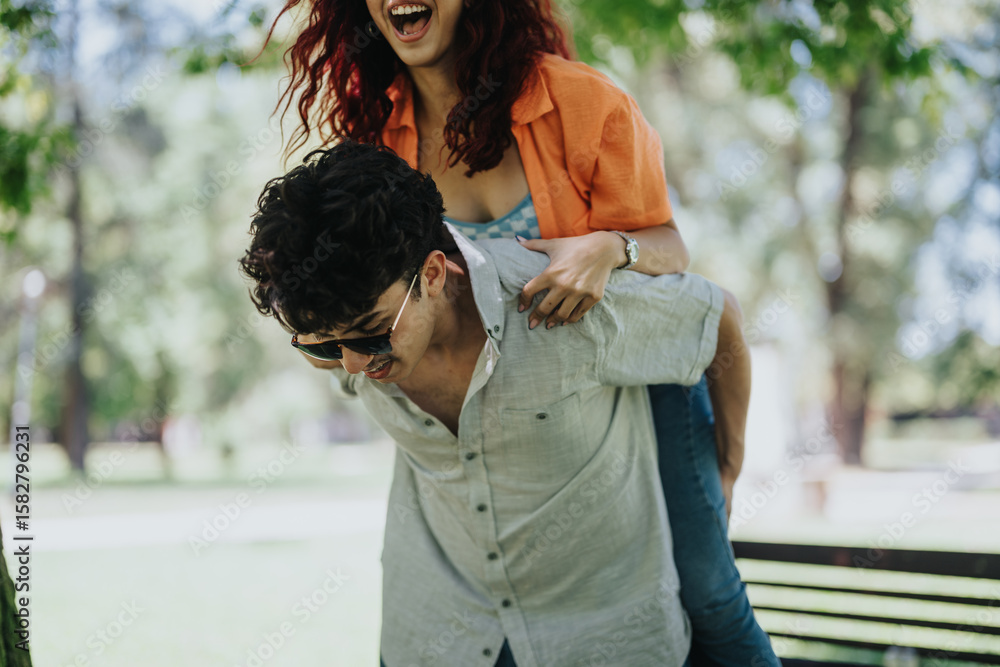 Young people having fun in the park, enjoying a piggyback ride and sharing laughter, capturing joyful moments of friendship and leisure.