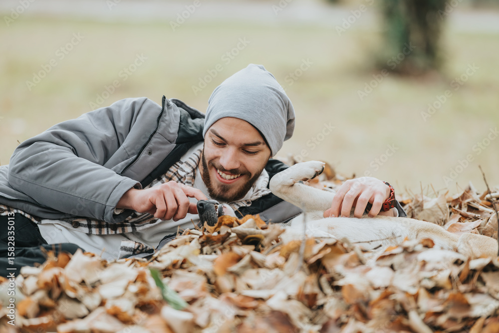 A man enjoys autumn by playing and bonding with his dog in fallen leaves outside. The image conveys warmth, happiness, and companionship in a serene and natural outdoor setting.