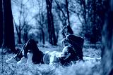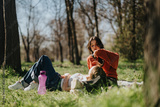 Two friends relax and share a serene moment outdoors in a park, enjoying the sunny weather and lush green surroundings.