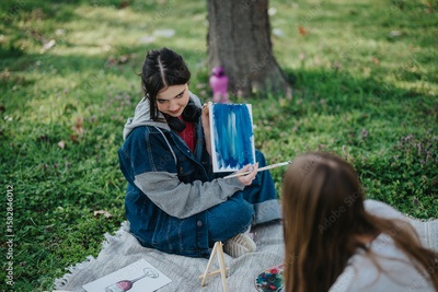 Two girls engage in artistic activities, sharing creativity through painting while enjoying a serene outdoor setting.