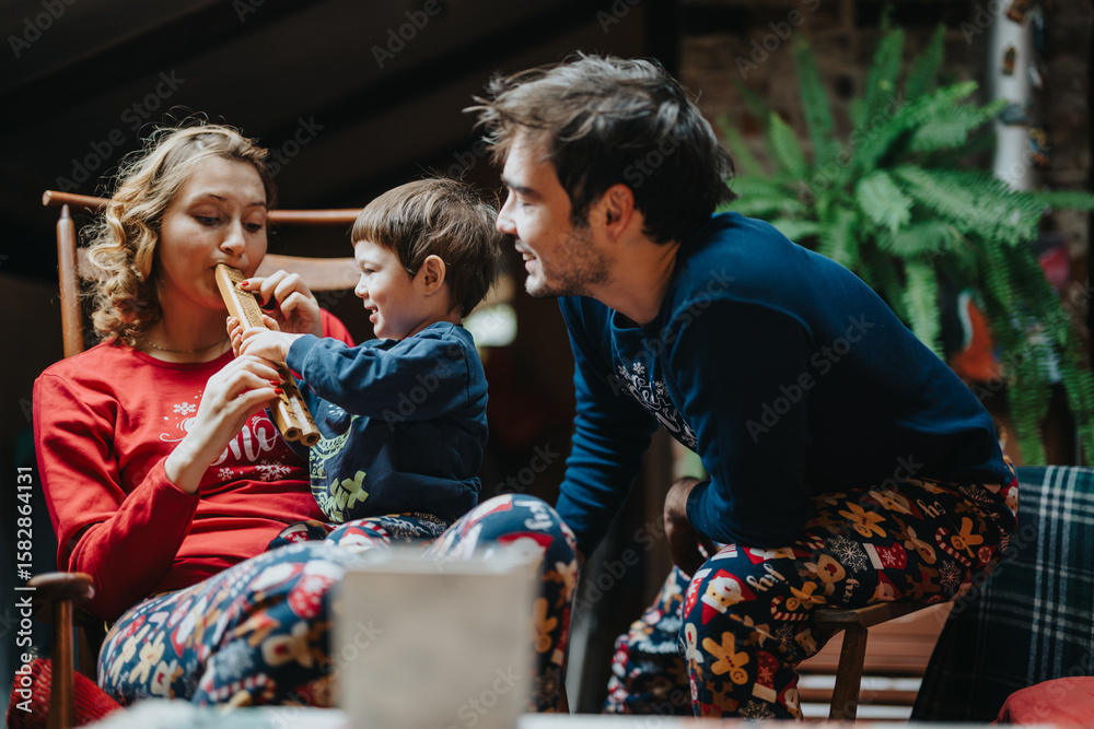 A family shares a joyful moment at home dressed in festive-themed pajamas, creating wonderful memories while engaging in meaningful, creative activities surrounded by holiday decorations and a warm