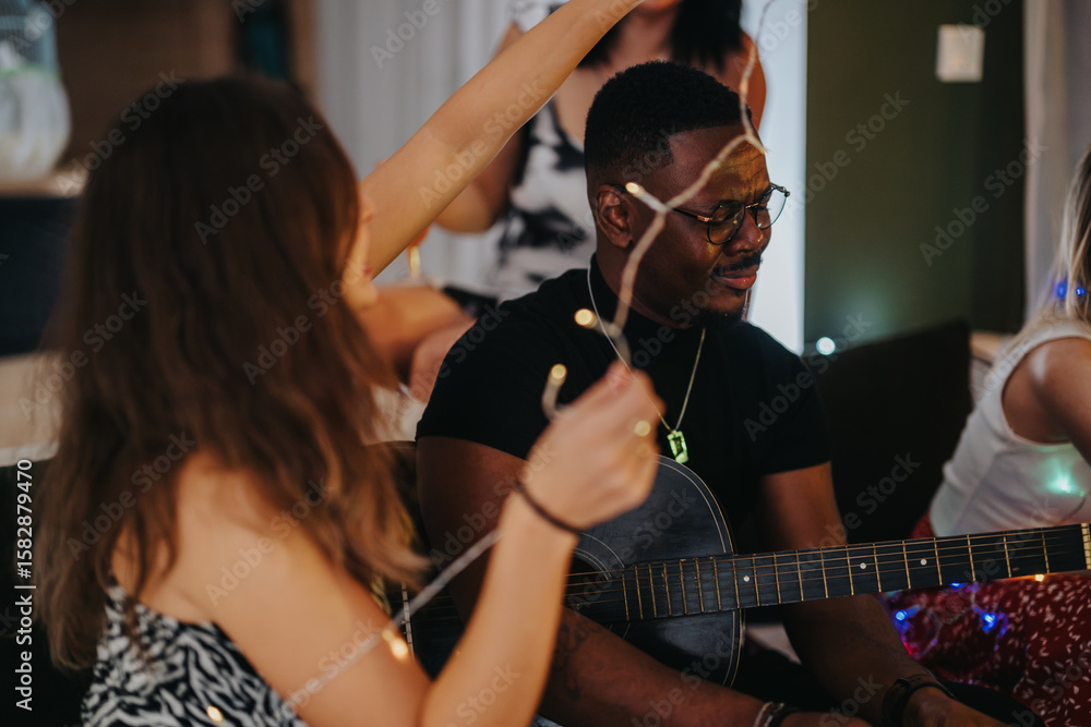 A group of friends enjoying a fun gathering, playing guitar, and creating memories in a cozy setting filled with laughter and lights.