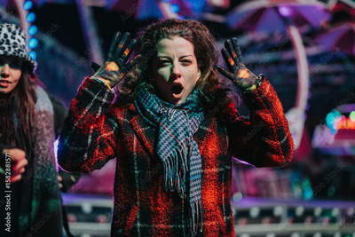 A cheerful young woman at a festive carnival at night, expressing joy and excitement amidst colorful lights, with her friends accompanying her in a lively atmosphere.