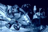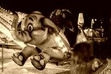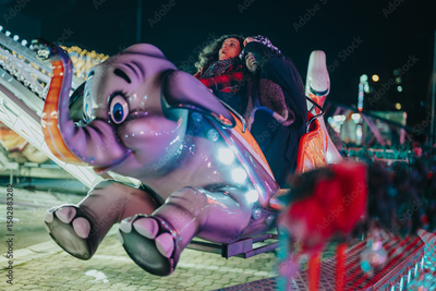 A lively scene of a nighttime funfair with colorful lights where friends ride a whimsical elephant-shaped carousel, capturing joy, laughter, and entertainment.