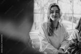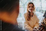 A young woman wearing a white shirt smiles warmly while seated indoors during a social occasion. The light filters through a window, adding a cozy ambiance to the scene.