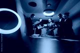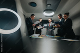 A group of business professionals collaborating in a meeting room under modern lighting, discussing documents and plans. The atmosphere conveys teamwork, productivity, and professional engagement.