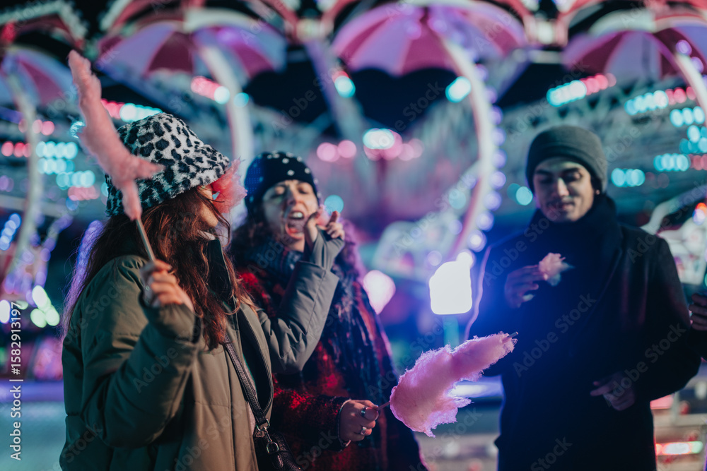 Image of friends laughing and eating cotton candy at a lively winter carnival. The colorful background, warm clothing, and cheerful expressions represent joy, togetherness, and winter festivities.