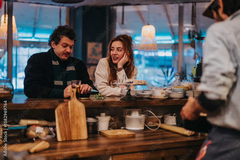 Two friends spending time together, sharing conversation at a cozy and warmly lit cafe.