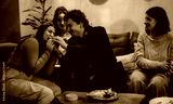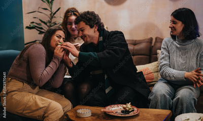 An intimate gathering of friends sharing food and joy in a cozy home setting.